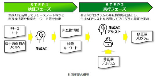 株式会社日本総合研究所(注1)(以下、日本総研)と、富士通株式会社(注2)(以下、富士通)は、株式会社三井住友銀行(注3)の「Red Hat Enterprise Linux」(以下、RHEL)のバージョンアップに伴う非互換対応に生成AIを活用する共同実証を行っています。2024年11月5日から2025年1月15日まで実施した検証フェーズでは、従来と比較して非互換情報などの抽出にかかる時間を約65%削減することができました。2025年1月16日からは、検証フェーズで特定した非互換箇所についてアプリケーションを修正する実行フェーズを開始しています。