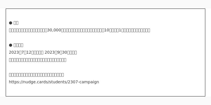 「学生部」では7月~9月の間、海外旅行応援キャンペーンを実施します。海外旅費代等をナッジカードで3万円以上決済した方で、現地で決済した金額を10回につき1回、もれなく全員に全額キャッシュバックいたします。詳細は学生部のInstagramをご確認ください。