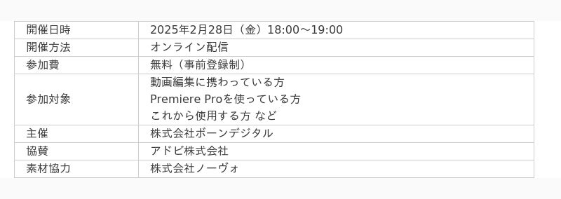 株式会社ボーンデジタル(本社:東京都千代田区、CEO:新 和也、URL:https://www.borndigital.co.jp)は、Adobe Premiere Proの新機能「生成拡張」を検証するオンラインセミナー「どこまでできる!?Adobe Premiere Pro 生成拡張の検証ウェビナー」を2025年2月28日 (金)に開催いたします。