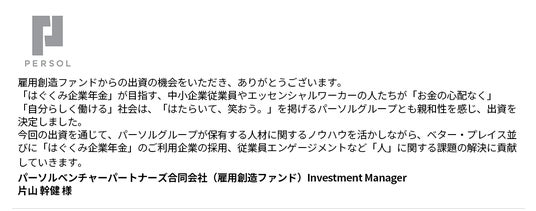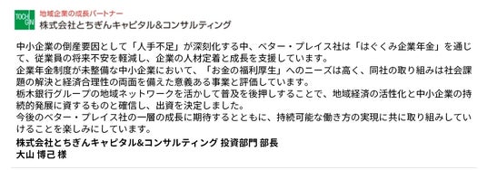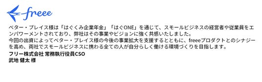 今回の資金調達は、より多くの中小企業の皆さまに企業年金制度をお届けすることで、働く方々の資産形成を支援するとともに、企業の採用力や人材定着率の向上に寄与したいというベター・プレイスの思いに、投資家の皆さまからご賛同いただき、実現いたしました。