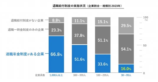 日本の全企業数のうち、中小企業数は99.7%、中小企業で働く従業員数は69.7%*¹と非常に多い中、従業員規模30~99人の企業で退職年金制度がある会社はわずか16%*²にとどまっています。
