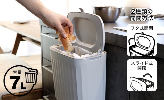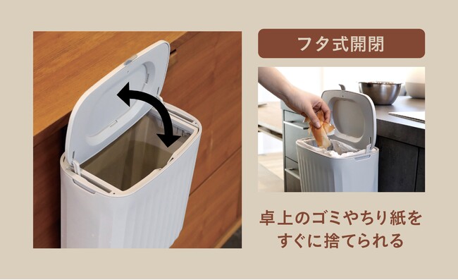 フタはそのまますぐにパカッと開ける「フタ式開閉」と、作業台側からゴミをスムーズに捨てられる「スライド式開閉」の2パターンの開き方ができ、場所に合った捨て方が選べます。