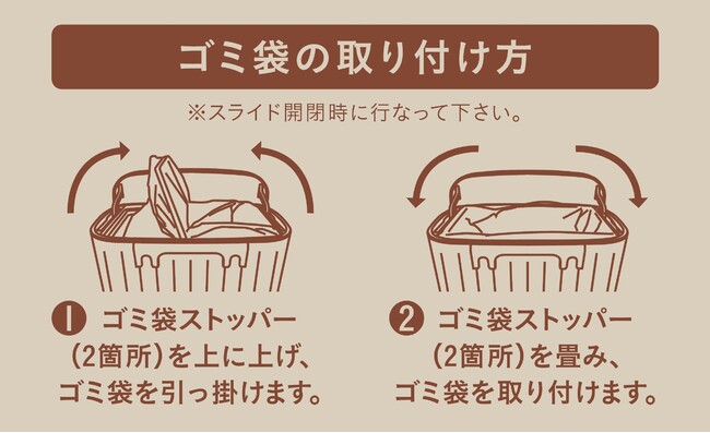 ゴミ袋を取り付ける際は、左右のストッパーを上に上げて引っ掛けるだけ。取り付けた後にストッパーを倒せばゴミ袋もズレにくく、イライラも解消されます。