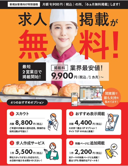 「BakeJob」求人サービス6か月無料掲載人材採用を支援し、店舗運営をサポートします。