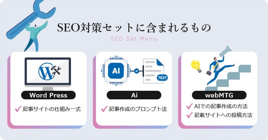 「SEO対策記事セット」は、LPの下層にSEO対策用の記事セクションを追加することで、静的なLPの構成に動的なコンテンツを加え、検索エンジンでの評価向上を図ります。また、コンテンツ作成が苦手な方でも活用しやすいよう、 AIプロンプト(無料) を導入し、簡単に記事が作成できるサポートも提供しています。このプロンプトでは、キーワードやテーマを入力するだけでAIがサポートし、効果的なSEO記事の作成が可能です。これにより、SEO対策の知識がなくても検索エンジンに好まれるコンテンツを作成し、集客効果を最大化できます。