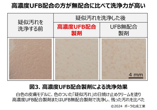 これを化粧品製剤に活用した結果、UFB無配合の製剤と比較して高い洗浄力を発揮する(図3)ことが分かり、さらに従来の界面活性剤と同等以上の十分な洗浄効果を1年以上も維持できることが分かりました。このことから、UFBを活用した新たな洗浄用化粧品の剤型技術を確立できたと言えます。
