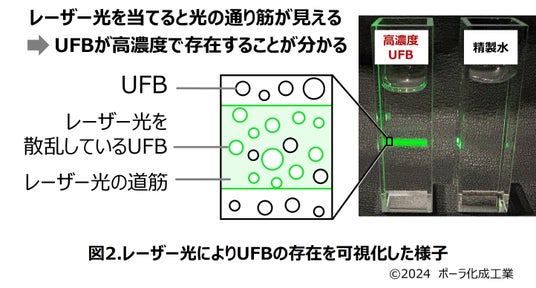 UFBとは、髪の毛の1/700程度(直径約100nm)の超微細な泡を液体中に分散させたもので、少しずつ産業利用が始まっています。本研究では、UFBを化粧品中に配合するために必要な基礎技術の確立と、UFB化粧品の機能性の確認に成功しました。