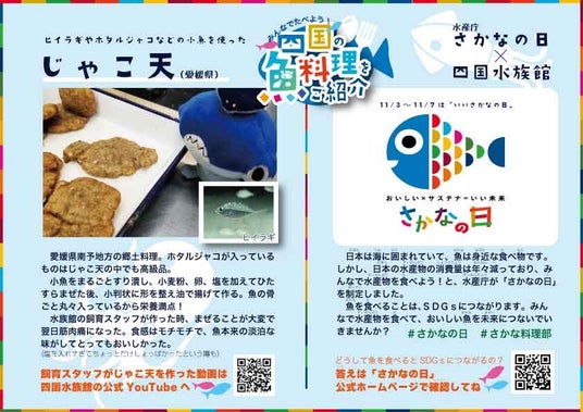 四国水族館(所在地:香川県綾歌郡宇多津町浜1番丁4)は、11月3日から7日の「いいさかなの日」にちなんで、2024年11月3日(日)~11月30日(土)の期間、魚を使った四国の名産品や郷土料理を、関連する生きものの水槽前にパネルを設置し紹介します。