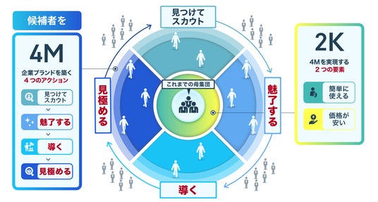 ※2:「4M2K」フレームワークとは、採用に特化し、企業ブランドを導く4つのアクション「見つけて・スカウト」「魅了する」「導く」「見極める」とアクションを実現する2つの要素「簡単に使える」「価格が安い」をフルサポートする独自の採用サービスを指す