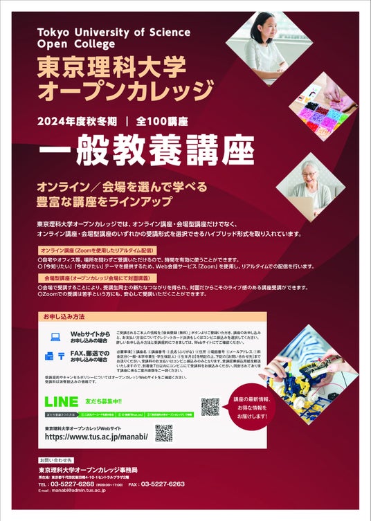東京理科大学オープンカレッジでは、「人生100年時代」を見据え、生涯現役で活躍できるよう多彩な講座を開講しています。