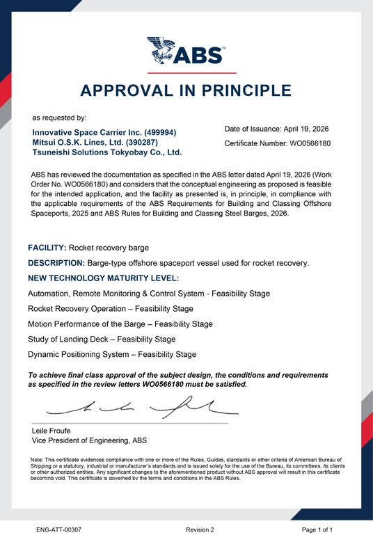 このたびISCは、株式会社商船三井(社長:田村 城太郎、本社:東京都港区、以下「商船三井」)および常石ソリューションズ東京ベイ株式会社(代表取締役社長:柴田 憲一、以下「常石ソリューションズ東京ベイ」)と連携し、ロケット洋上回収船の基本設計について、米国船級協会(American Bureau of Shipping、以下「ABS」)よりAiP*(Approval in Principle、基本設計承認。以下「AiP」)を取得しましたことをお知らせいたします。