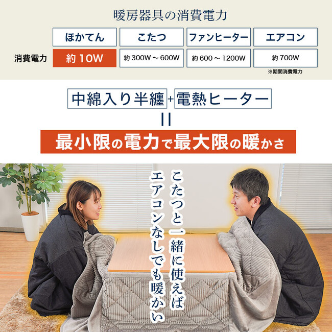 部屋の中が寒い。こたつを置く場所がない。暖房をつけると電気代がかかる。そんな方におすすめの『電熱半纏「ほかてん」』です。
