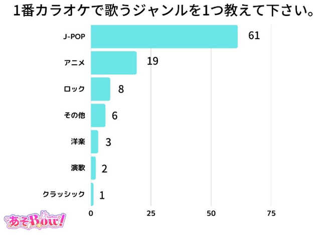 合同会社Makima(https://makima.co.jp/)が運営するアミューズメント情報メディア「あそBow!」(https://cocoaorei.work/asobow/)は、日本全国の10代以降の男女の方を対象に「1番カラオケで歌うジャンルを1つ教えて下さい。」についてのアンケート調査を実施しました。
