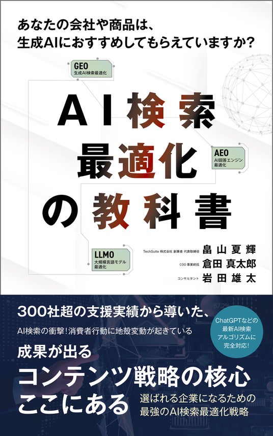 AI検索パートナーズのサービス開始に合わせ、当社ではAI検索最適化に関するノウハウを体系的にまとめた書籍『AI検索最適化の教科書』(著:畠山 夏輝、倉田 真太郎、岩田 雄太)を2026年3月に出版いたしました。本書はAmazon Kindleにて販売中です。なお、お問い合わせいただいた方全員に、本書のPDF版を無料でプレゼントいたします。