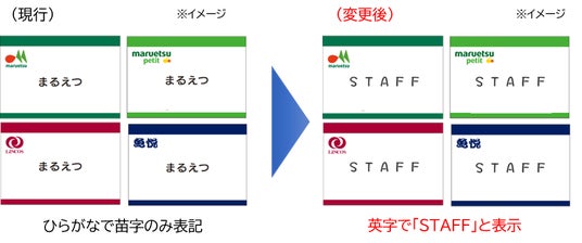 現行ルールでは、ひらがなで苗字のみを表記しておりますが、従業員のプライバシー保護の観点から、英字で「STAFF」表示の名札を着用するルールに変更いたします。