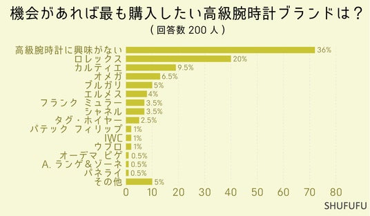 機会があれば最も購入したい高級腕時計ブランドを尋ねたところ、1位は「高級腕時計に興味がない(36%)」、2位「ロレックス(20%)」となりました。高級腕時計に興味がない人が3人に1人以上という結果になりました。実質1位の高級ブランドである「ロレックス」は高級腕時計の定番ブランドですが、値上がりの話題を耳にする機会も多く資産価値としての高さの面で気になっている方も多いようです。