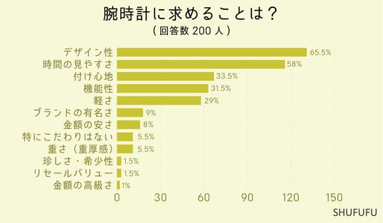 腕時計に求めることに関しては1位「デザイン性(65.5%)」、2位「時間の見やすさ(58.%)」でした。機能性よりも見た目を重視する方が多く、アクセサリーとしての需要の方が高そうです。