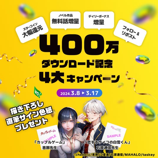 キャンペーン期間中、デイリーボーナスとしてスターコインが毎日2回もらえるキャンペーンや、ノベルが合計1,500話以上無料になるキャンペーンなどお得なキャンペーンを実施中!