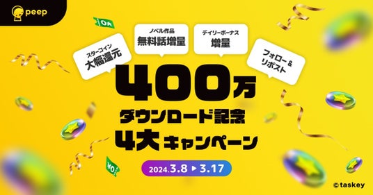 マンガ・ノベルアプリ「peep(ピープ)」の開発・運用やマンガ・Webtoonの制作・原作提供をおこなうtaskey株式会社(本社:東京都渋谷区、代表取締役CEO:大石 ロミー)は、peepが400万ダウンロードを突破したことを記念して、お得な4大キャンペーンを実施中です。
