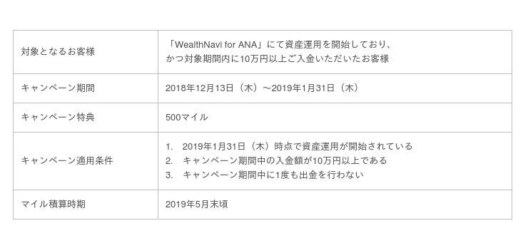 今回のキャンペーン(18年12月13日~19年1月31日)は、キャンペーン期間中に「WealthNavi for ANA」の最低投資金額が10万円(通常時は30万円)になることを記念したもので、条件を満たしたお客様に500マイルが付与されます。