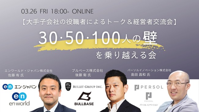 決裁者同士のマッチングを支援する決裁者マッチングSaaS「チラCEO(URL:http://bit.ly/3rRYuSo )」を運営する株式会社オンリーストーリー(代表取締役:平野哲也、本社:東京都渋谷区)は、3/26(金)18:00~「30・50・100人の壁を乗り越える会【大手子会社の役職者によるトーク&経営者交流会」を開催します。
