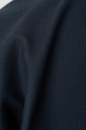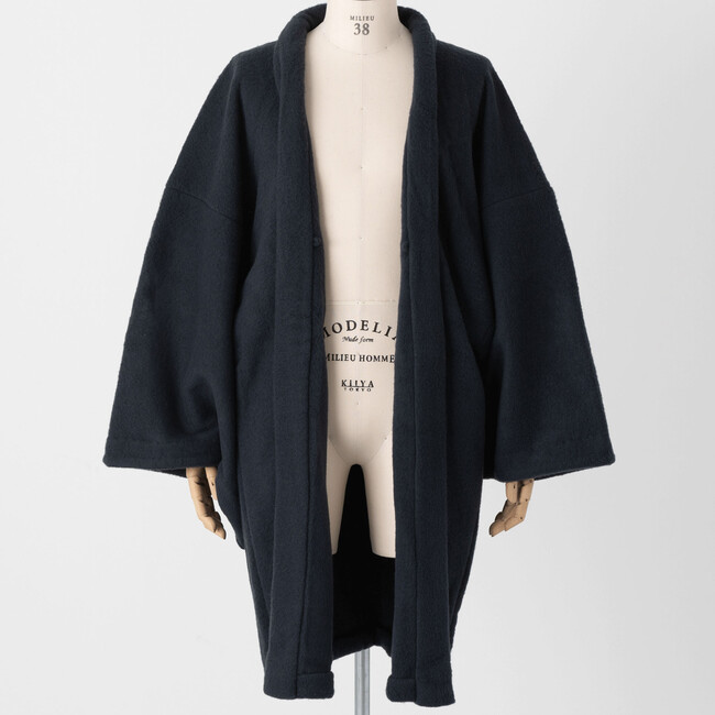 Graphpaperとのコラボレーションで初めてきものの上から羽織れるコートを製作しました。素材はコットンの中でも繊維が細く長く、触り心地もしっとりとしたスーピマコットンを使用しています。きものの上からも羽織っても快適に過ごせるよう肩山の調整・袖の縫い目の曲線などに拘っていただき、打ち合わせを重ねたことによって完成しました。また腕を下ろした際には袖部分の生地のたまりがきれいに折り畳めるようになっており、羽織った佇まいもすっきりと上品になります。