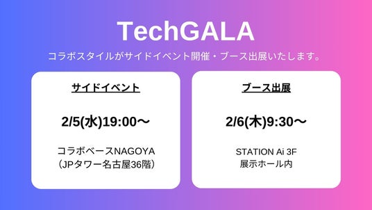 株式会社コラボスタイル(所在地:愛知県名古屋市、代表取締役社長 兼 CEO:松本 洋介)は、2025年2月4日(火)~2月6日(木)に愛知県名古屋市で開催される地球の未来を拓くテクノロジーの祭典「TechGALA Japan」において、サイドイベントの開催およびブース出展を行います。