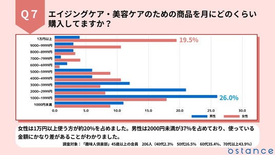 エイジングケア・美容ケア用品の購入額は女性は月1万円以上使う回答が19.5%を占めた一方、男性は月2000円未満が37%を占めた