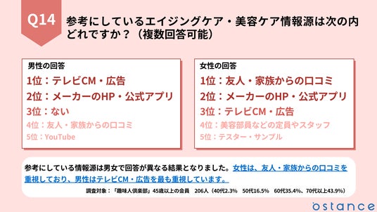 参考にしている美容情報源として女性は「友人・家族からの口コミ」が最多なのに対し、男性は「テレビCM・広告」が最多