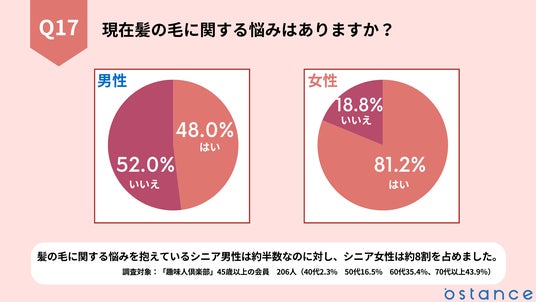 髪の毛に関する悩みを抱えているシニア男性は約半数なのに対し、シニア女性は約8割を占めた