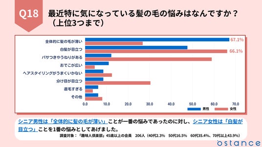 気になっている髪の毛の悩みはシニア男性は「全体的に髪の毛が薄い」ことが最多であるのに対し、シニア女性は「白髪が目立つ」ことが最多