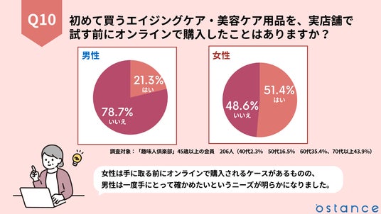 「初めて買うエイジングケア・美容ケア用品を実店舗で試す前にオンラインで購入したことがありますか?」という質問に対して、男性は21.3%がはいと答えたのに対し、女性は半数以上の51.4%がはいと答えました。購入した商品は男女共にスキンケアが最多でした。