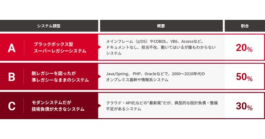 SHIFTが考える「レガシーシステムの3類型」(割合はSHIFT推定値)