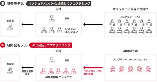 SHIFTは、AI駆動開発プラットフォームを活用した革新的なソフトウェア開発手法に加え、従来のソフトウェア開発プロジェクトにおいてオフショアや二次請け企業が担っていた開発工程をAIエージェントが代替する、新たなプロジェクトマネジメントの方法論を構築しています。また、これにより開発エンジニアやプログラマーのあり方が変わることを踏まえ、AI活用を前提とした新たな人材育成プロセスの構築を進めています。