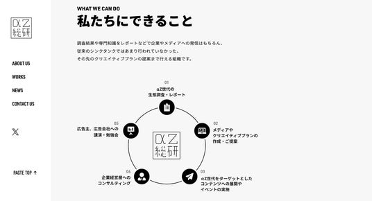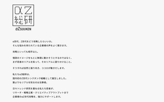『αZ総研』は、α世代・Z世代を研究対象としたシンクタンク組織です。シンクタンクとして機能すべく、調査結果や専門知識のレポートなどを企業やメディアに提供するのはもちろんのこと、従来のシンクタンクではあまり行われていなかった、その先のクリエイティブプランの提案まで行います。ジェネレーションα・ジェネレーションZをターゲットとした商品や企画に携わるすべての企業にとって最良のマーケティングパートナーになることを目標に、企業と生活者のコミュニケーションデザインのすべてをワンストップで任せられる組織体制を整えております。