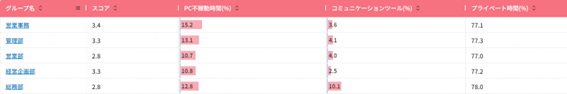 PC作業の可視化だけではなく、従業員ごとの業務負荷や周囲とのコミュニケーション度を総合的に見て従業員の働き方の満足度を定量的に可視化します。人的なリソースが重要視される中、プライベート時間をしっかり確保できているか、業務負荷でオーバーワークになっていないか把握することで長く働き続ける職場を実現できます。