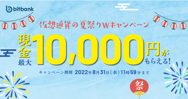ビットバンク株式会社(本社:東京都品川区、代表取締役社長:廣末紀之、以下「ビットバンク」)では、皆様の日頃のご愛顧に感謝をこめて、2022年7月15日(金)~2022年8月31日(水)11時59分まで、「最大10,000円がもらえる!仮想通貨の夏祭りWキャンペーン」を実施いたします。