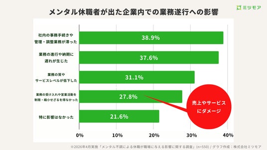 メンタル休職者が出た企業の約8割で、納期遅延・受注制限など業務に支障
