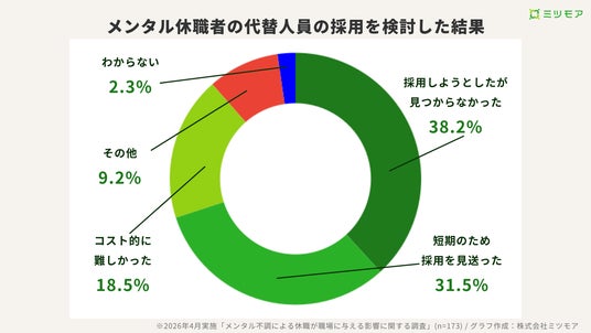 休職者の業務への対応方法を聞いたところ、71.5%が「他の従業員で分担した」と回答。代替人員の採用を検討した企業のうち、38.2%は「採用しようとしたが、見つからなかった」と答えており、「離職でも採用難でもないのに人が足りない、しかもその穴を埋める人材も見つからない」という二重の困難に陥っている実態が明らかになりました。