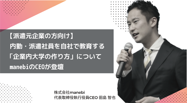 株式会社manebi(東京都豊島区 代表取締役執行役員CEO:田島 智也 以下、manebi)のCEO 田島 智也は、株式会社人材ビジネス経営研究所(兵庫県神戸市 代表取締役社長:山内 栄人 以下、人材ビジネス経営研究所)が開催する「高付加価値型アウトソーシング研究会」のゲスト講師として4月20日(木)に登壇いたします。登壇テーマを「内勤・派遣社員を自社で教育できる体制~経営戦略としての『企業内大学のつくり方』超入門~」と題し、人材ビジネス企業における教育体制の構築法について解説します。
