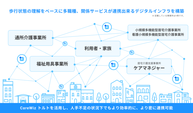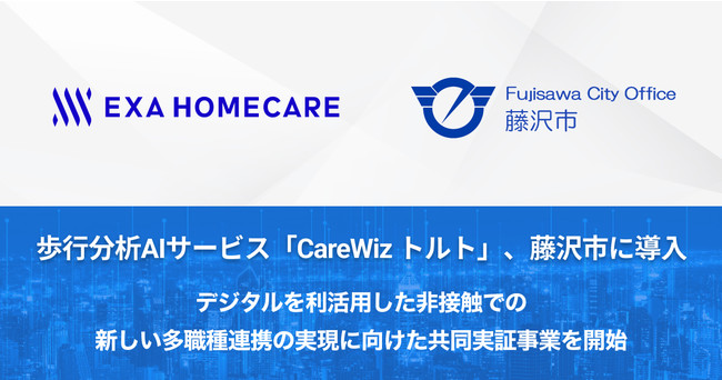 このような背景のもと、エクサホームケアはこのたび、通所介護事業所、小規模多機能型居宅介護事業所、福祉用具事業所等の介護に関連する多職種の事業者向けに、デジタルを利活用した非接触での新しい情報連携の実現に向けて、藤沢市と共同で歩行分析AIサービス「CareWiz トルト」を活用した実証事業を開始しました。