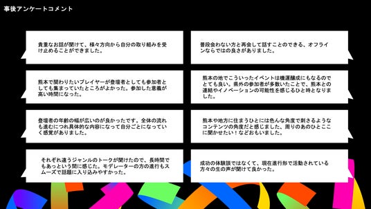 イベント後のアンケートでは、私たちが心がけていた点に関して多数のお褒めの言葉をいただきました。