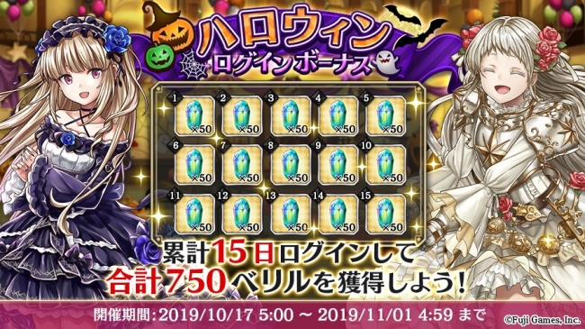 ・開催期間を過ぎると「ハロウィンログインボーナス」が終了しますので、ゲーム開始時期によりましては、15日分の報酬が入手できない場合がございます。