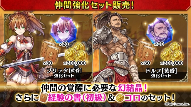 ピックアップ召喚の開催に伴い、「ショップ」の「ベリル購入」にある「アイテム購入」に「ブリッタ[黄昏]強化セット」と「ドルフ[黄昏]強化セット」が追加されます。