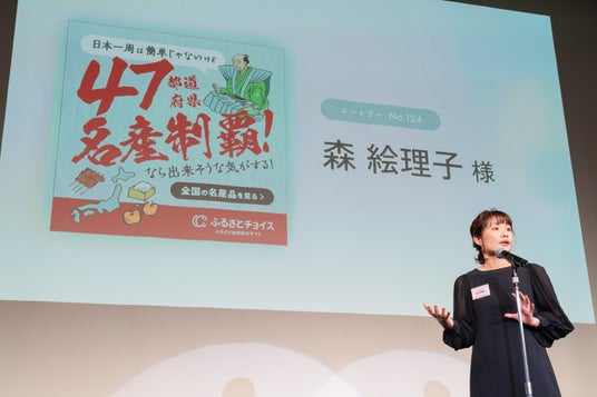 「ふるさと納税のバナーは、美味しそうな肉や魚介などの画像をメインにしたバナーが多い中、コピーを主役に持ってきてイラストでイメージを補完して表現している点にオリジナリティがある。今回のコンテストという形式だからこそ生まれたであろう自由な発想を評価した(秦亜紀子氏)」とコメント。