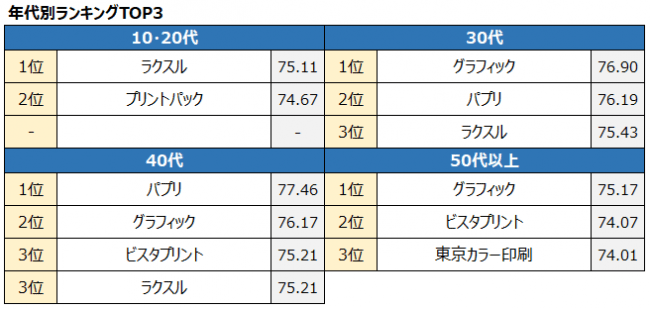続いて、【ラクスル(ラクスル株式会社 本社:東京都品川区)】が総合3位のほかに、年代別「10・20代」、商品別「カード」「パンフレット」「ポスター」「POP」の5部門で1位にランクインとなりました。