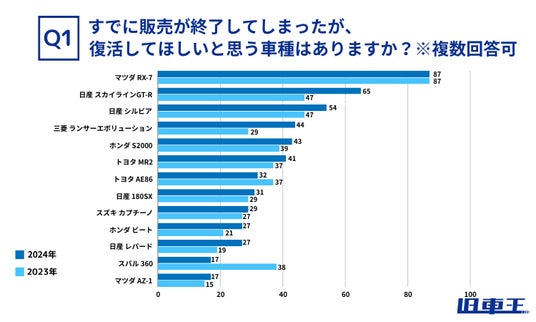・調査内容:Q1.すでに販売が終了してしまったが、復活してほしいと思う車種はありますか?※複数回答可 Q2.Q1で回答した車種の復活してほしい理由について教えてください。