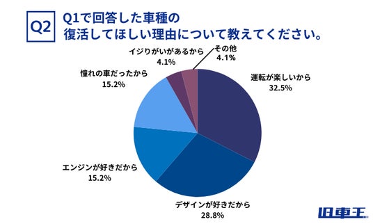旧車好きの方に、Q1で選択した車種の復活してほしい理由について尋ねてみると、「運転が楽しいから」が32.5%で最も多い回答となりました。