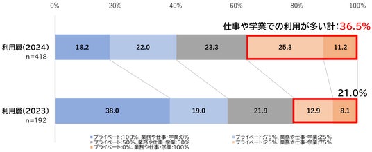 ・プライベートより、仕事や学業で生成AIを利用するという人が昨年度調査より大幅に増加。