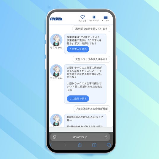新機能「AI求人検索」では、ドラEVERの新キャラクター「箱守もこは」通称「もこちゃん」が、求職者の皆さんと対話形式でコミュニケーションを取りながら、一人ひとりにパーソナライズされた求人情報を提案します!